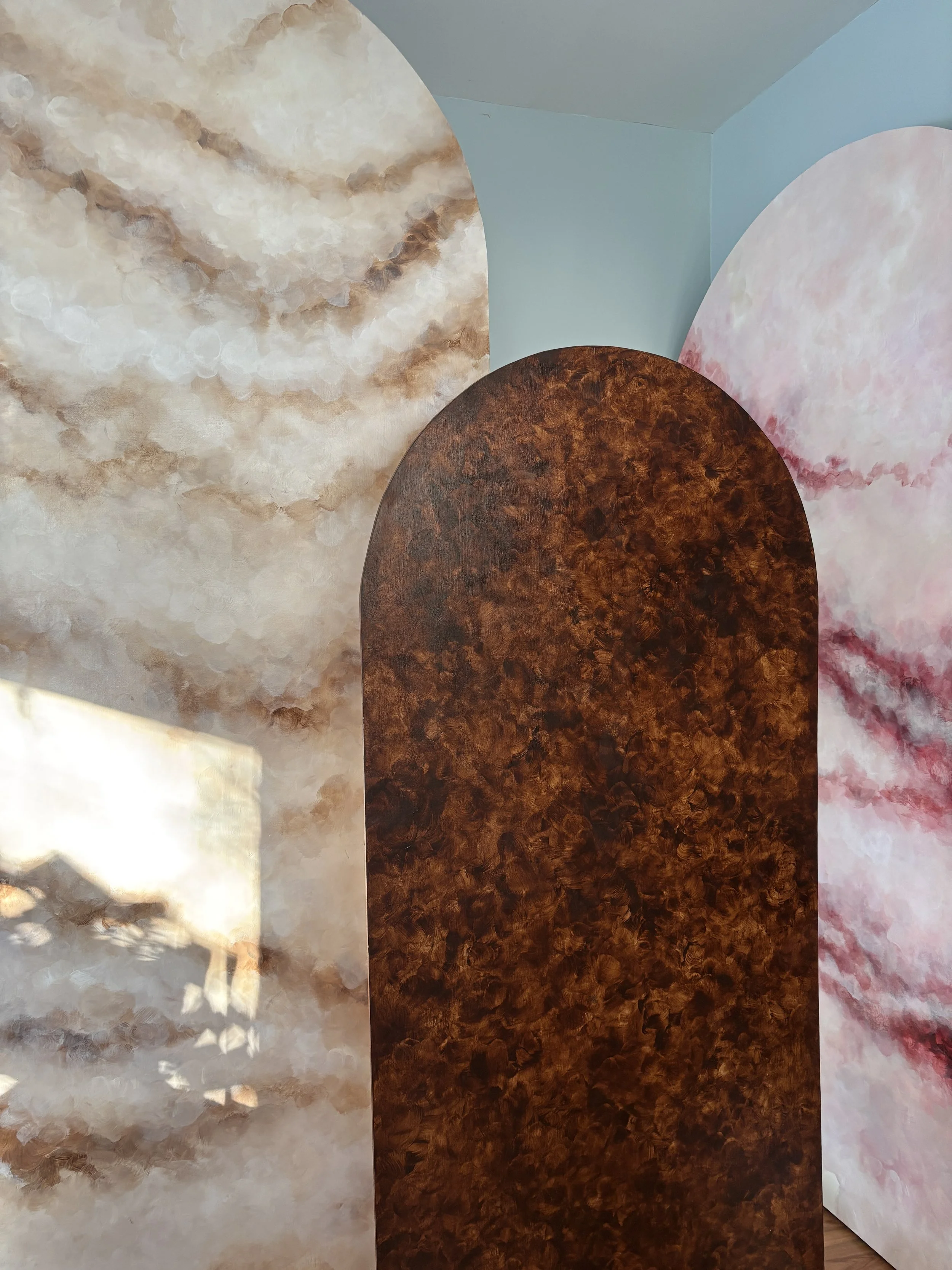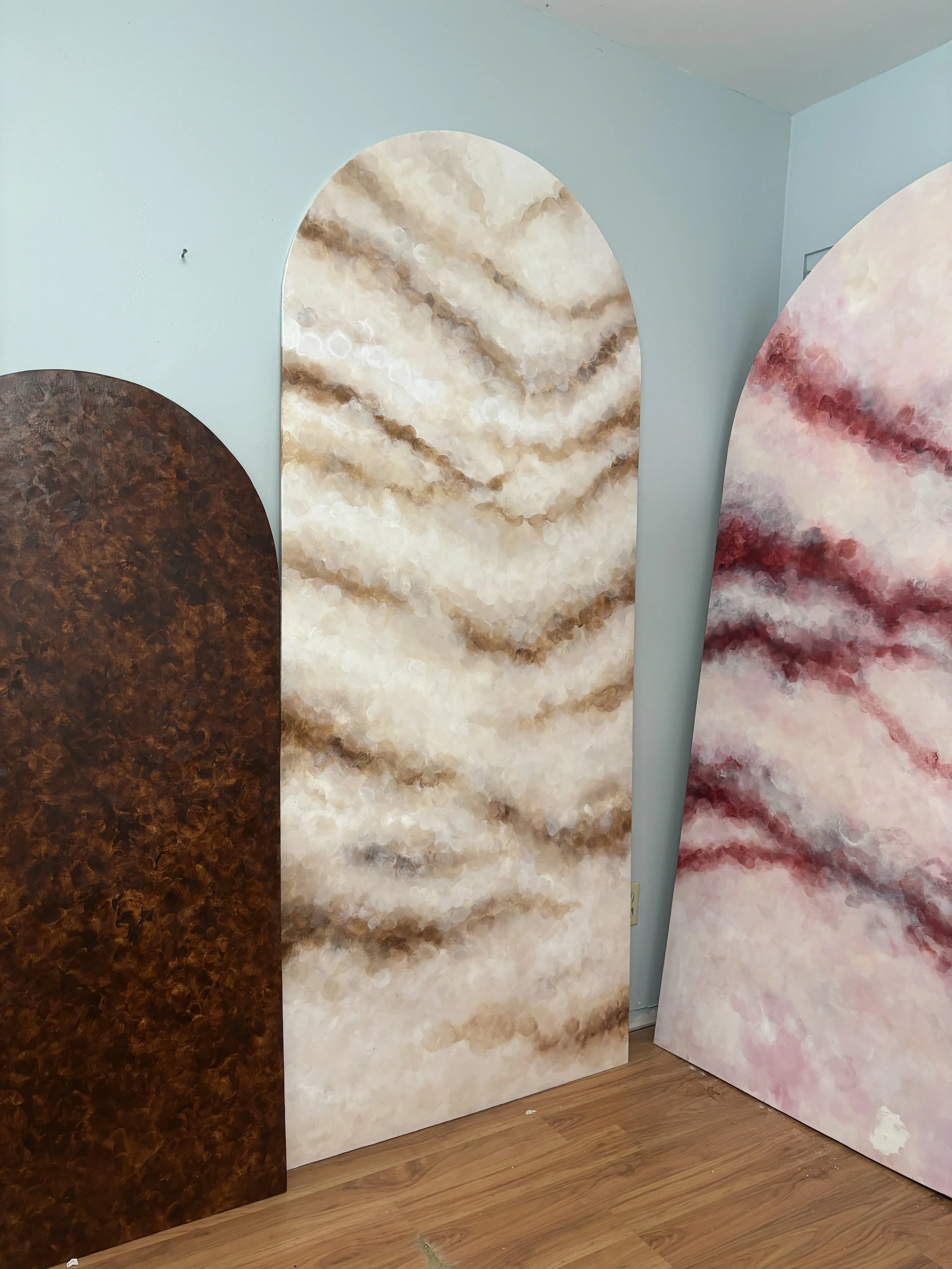3ft x 7ft & 2.4ft x 5ft arches hand painted to give your event space an elevated feel. Hardware attached on back for floral/decor attachment.